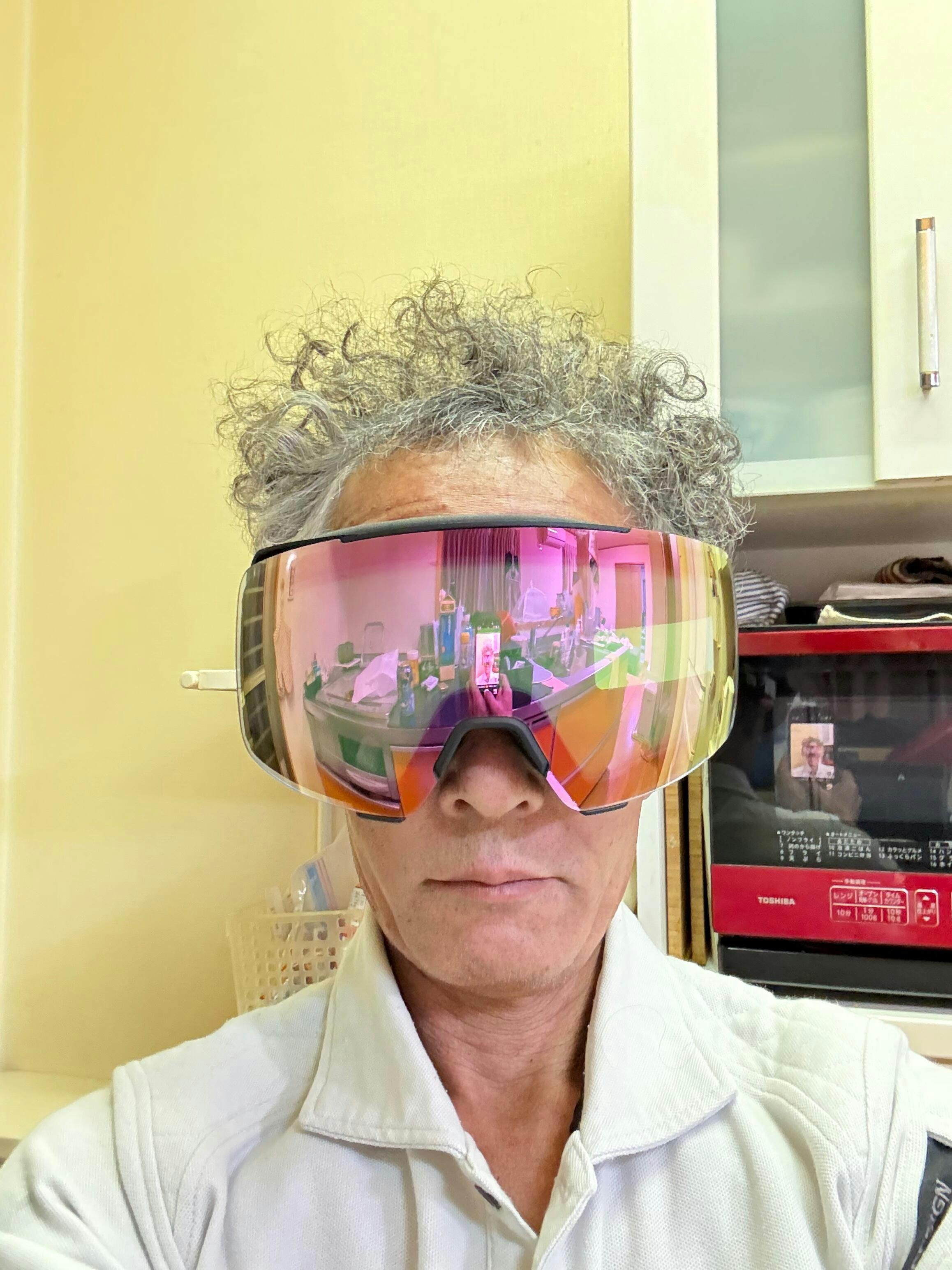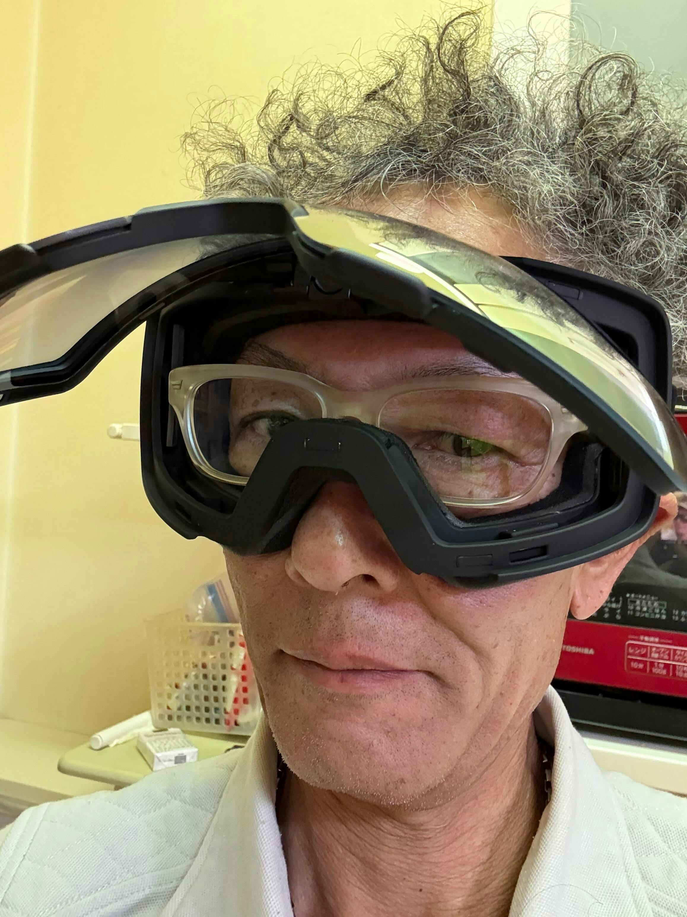 あって、ゴーグル本体を少し歪めるように掴むとフリップしやすいです。閉める時は上下に揺さぶってあげるとパチンとハマります。